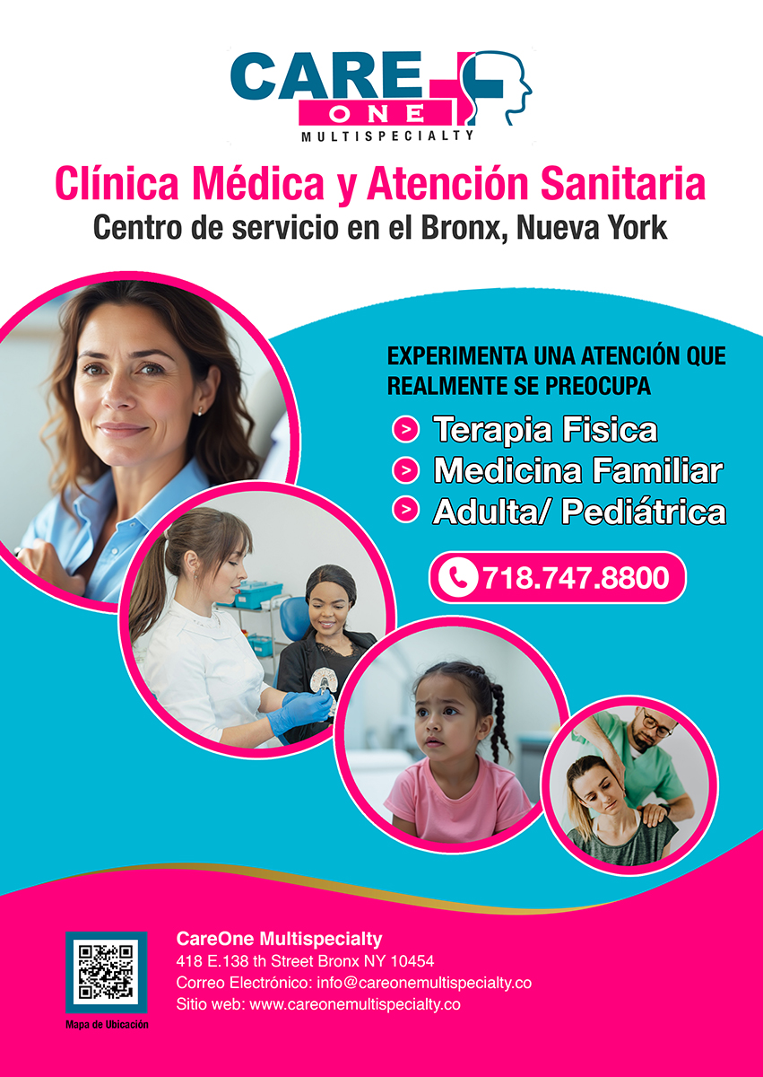 CareOne Multispecialty es una clínica médica de confianza en el Bronx, Nueva York, que ofrece atención integral para adultos y niños. Nuestro experimentado equipo de atención médica ofrece medicina familiar, Terapia Fisica, atención preventiva y tratamiento para una amplia variedad de condiciones, todo ello con el compromiso de brindar una atención compasiva y centrada en el paciente que apoya su salud y bienestar.